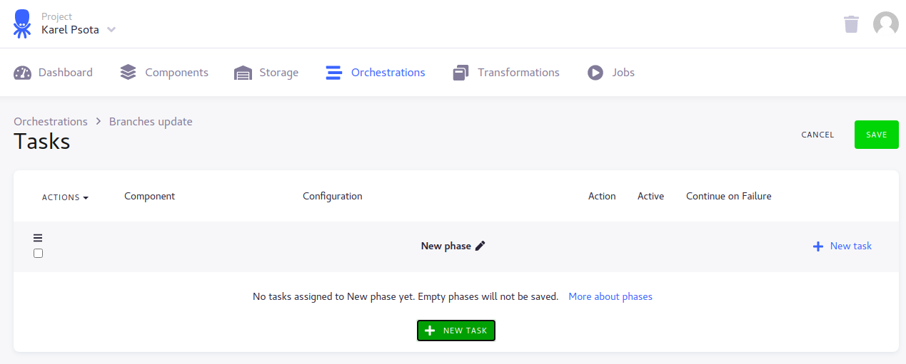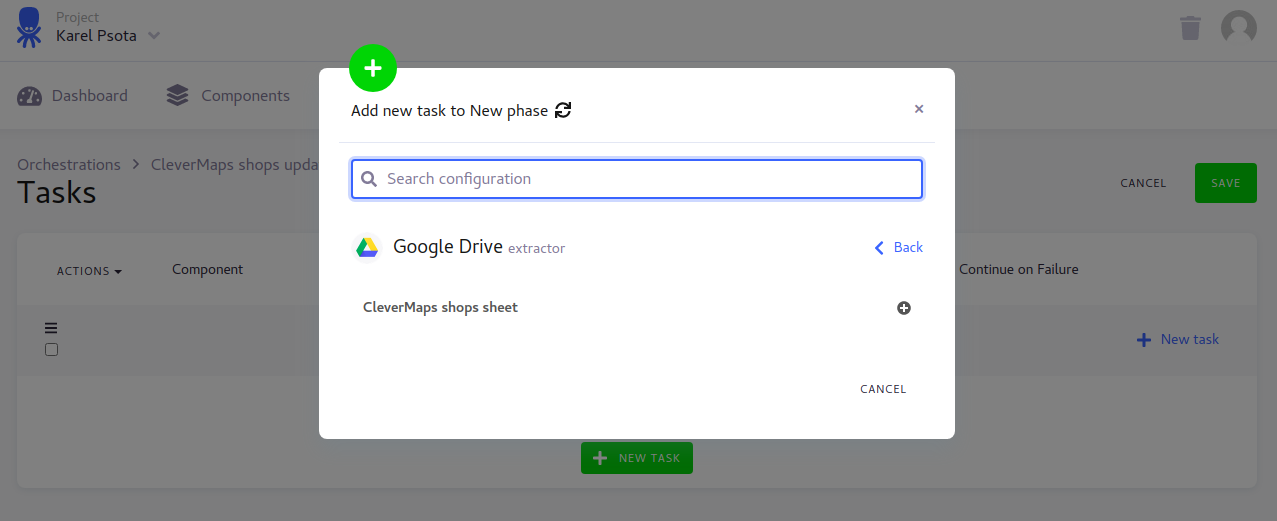 First of all we will add our Google Drive Extractor and CleverMaps Writer configuration. Click edit pencil icon of the “Tasks“