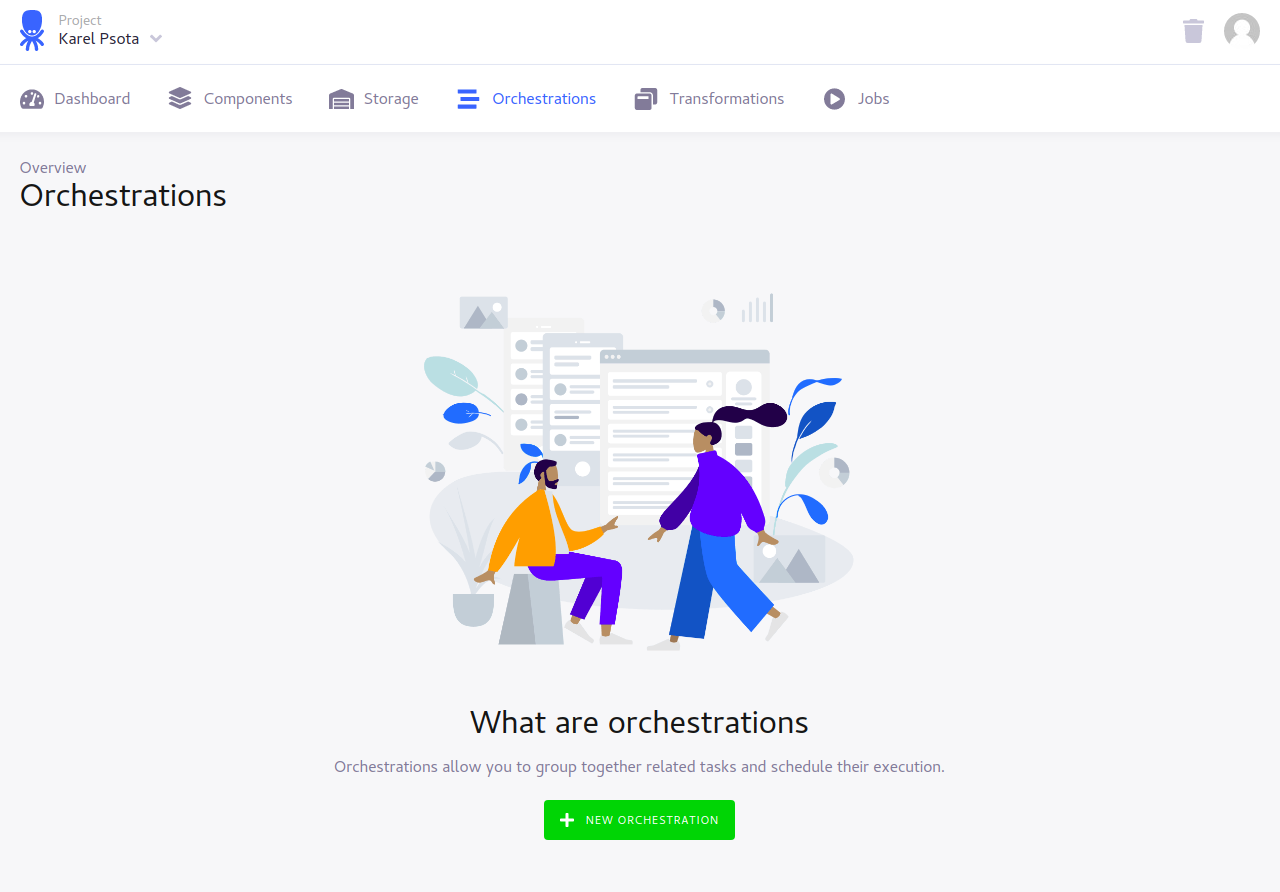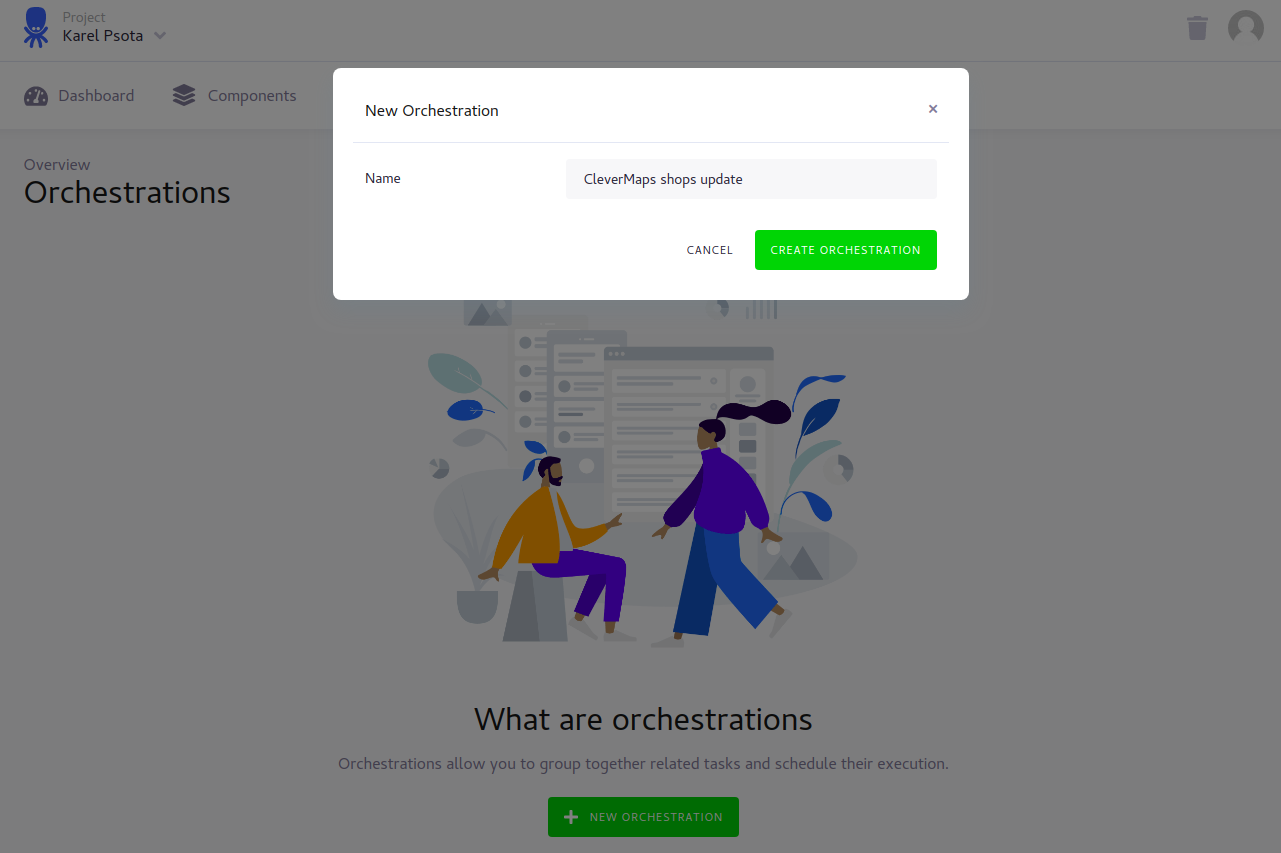 We will create a new free Keboola project, then we will setup a Google Drive Extractor for getting the data from our shared Google Sheet, then we will setup a CleverMaps Writer for loading the data from Google Sheet into the CleverMaps platform. Finally we need to create an Orchestration which will glue our extractor and writer together and we will also setup a schedule of the orchestration.
