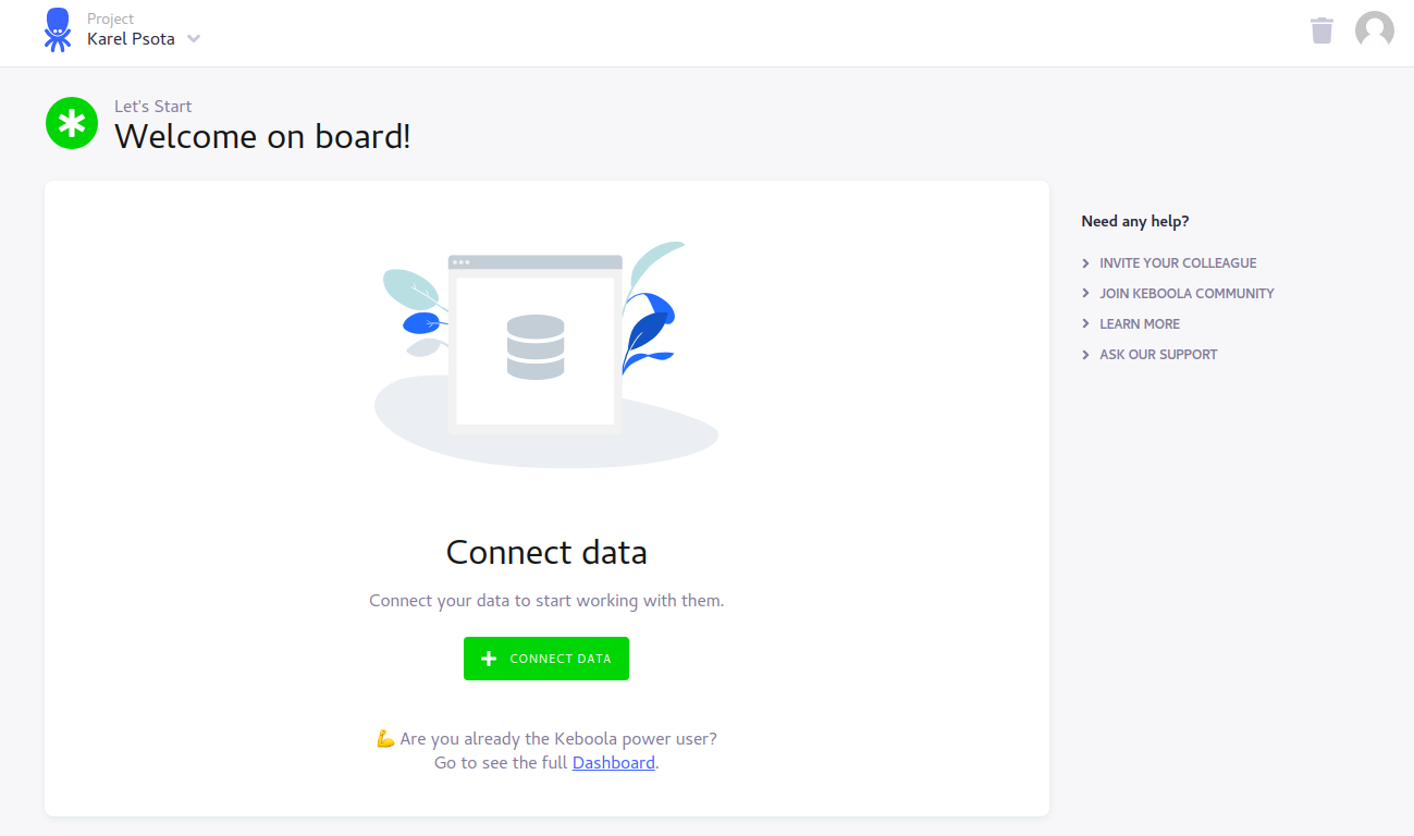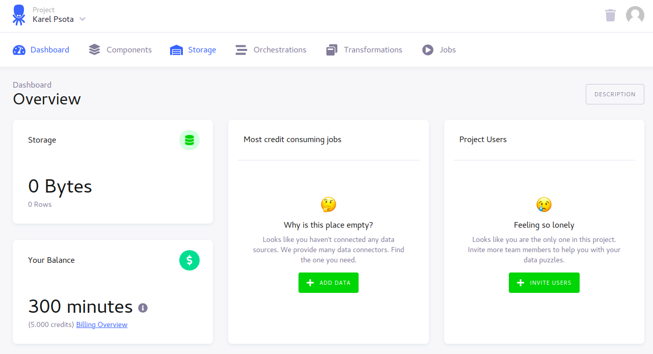 Now you should see the main Dashboard. Your free Keboola project was successfully created and now you can setup your data pipeline.