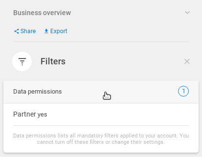 If data permission is applied to you as a logged user, you are notified about this fact by having an active data permission filter in the Filters tool.