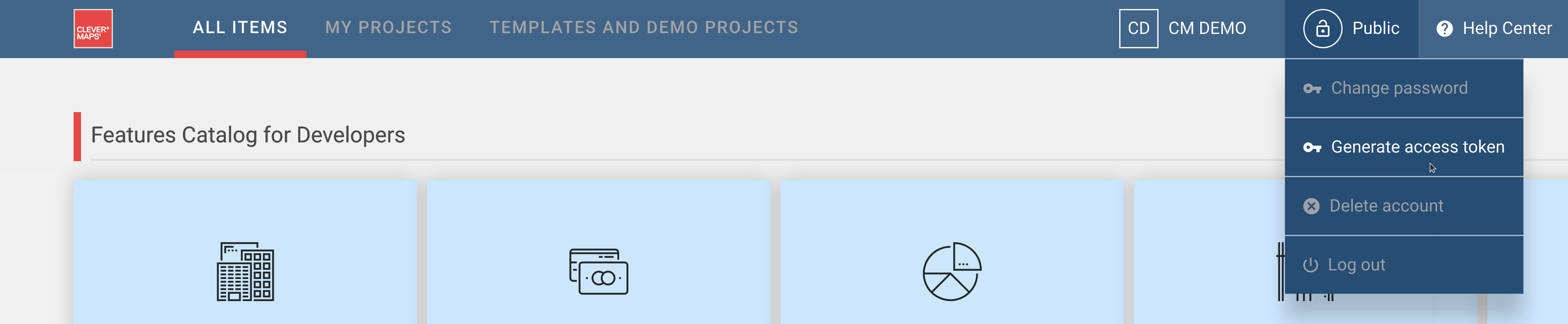 Access the clevermaps platform with your service user credentials and generate an access token by clicking the option in public access menu in top toolbar.