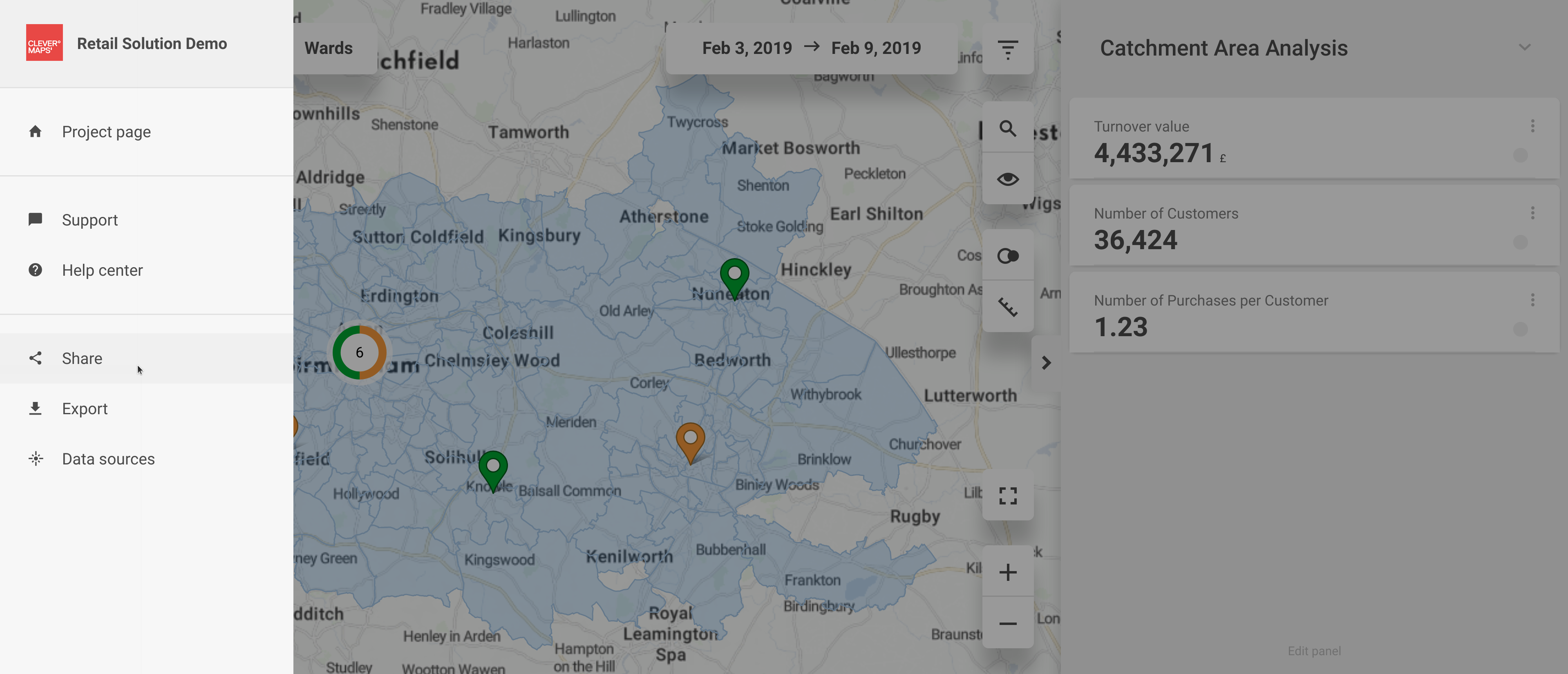 In format https://secure.clevermaps.io/#/yufqzxkbiecj7jot/map/catchment_area_view?shareId=sh4r3l1nk1d&token=ACC355T0K3N