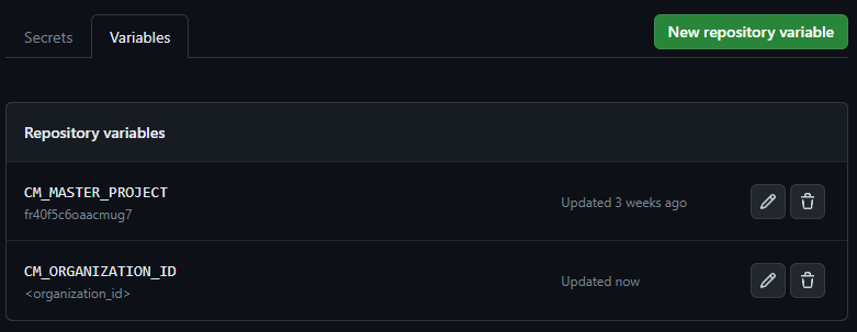 If CleverMaps have assigned your organization an organization ID (if not, skip this step), add it to the GitHub repository variables. Name the variable CM_ORGANIZATION_ID and paste the organization ID. Save the variable.