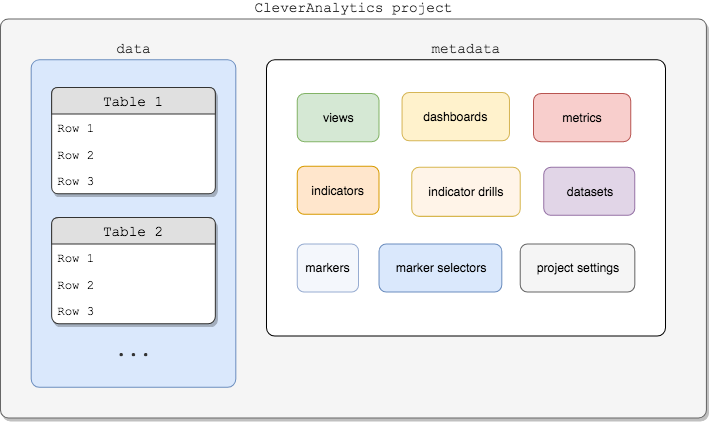 Each CleverMaps project consists of data and metadata. There are 12 types of metadata objects. Each type configures different aspect of the project. These objects naturally have relations between them, and together they form a metadata model. You can read more about the model in its own section.
