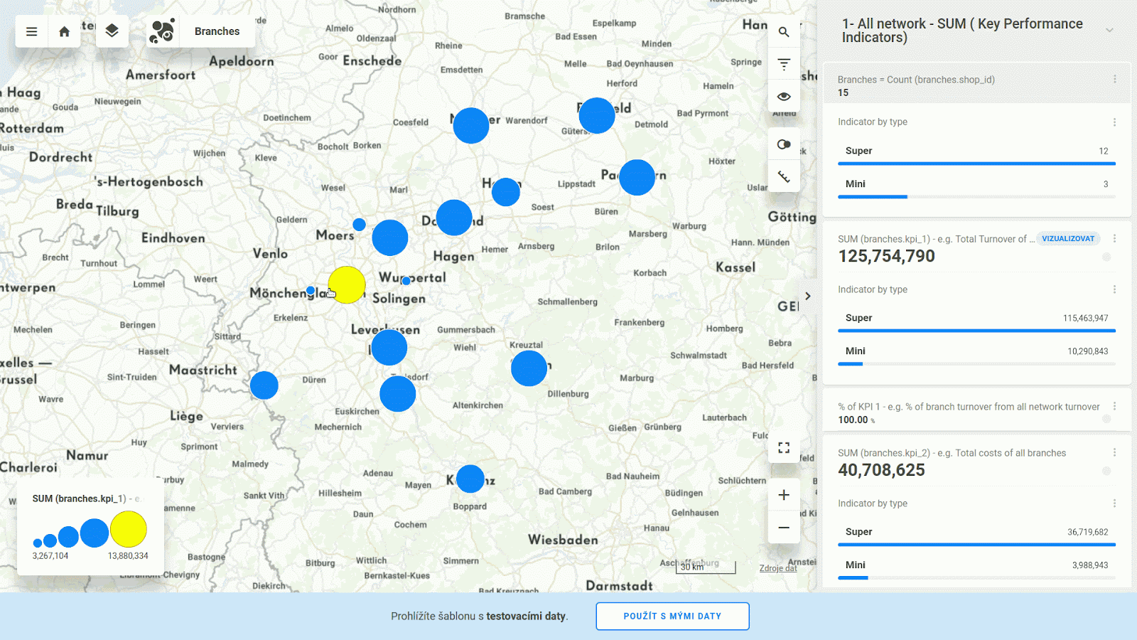 Or even you can select your branches by spatial query. For example, find out SUM of KPI 1 from branches in 36 km radius distance around town Hagen.