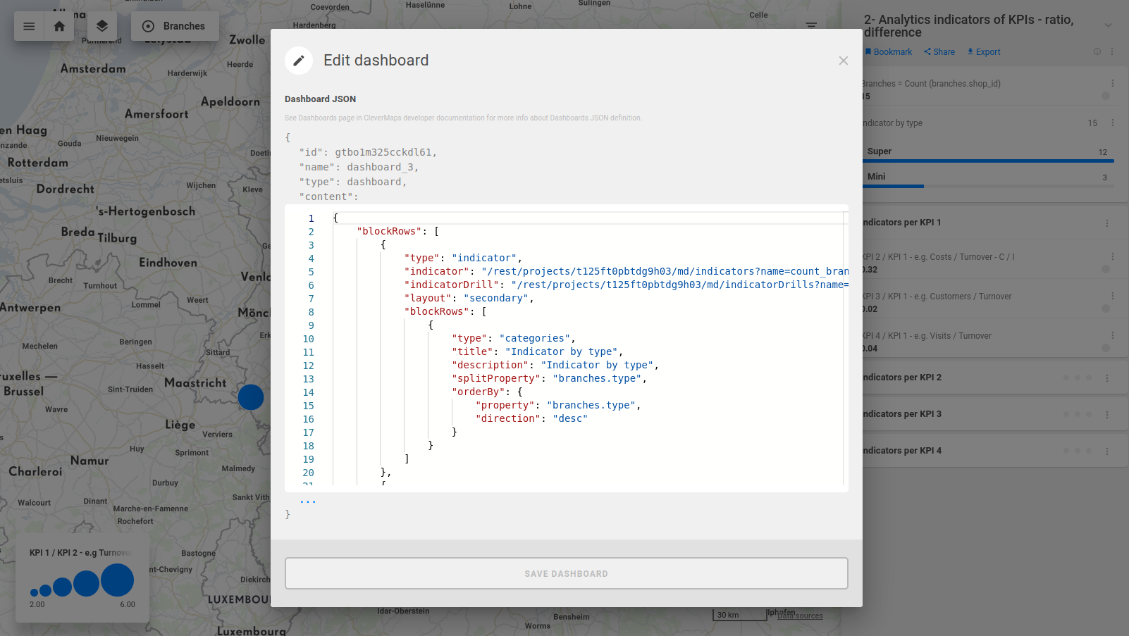 In case you need an additional metric, you can add it by cloning one of those you already have on the dashboard. After a metric is cloned, the metric must be edited. That can be done by clicking on three dots and edit metric. All functions which can be used in CleverMaps can be found here.