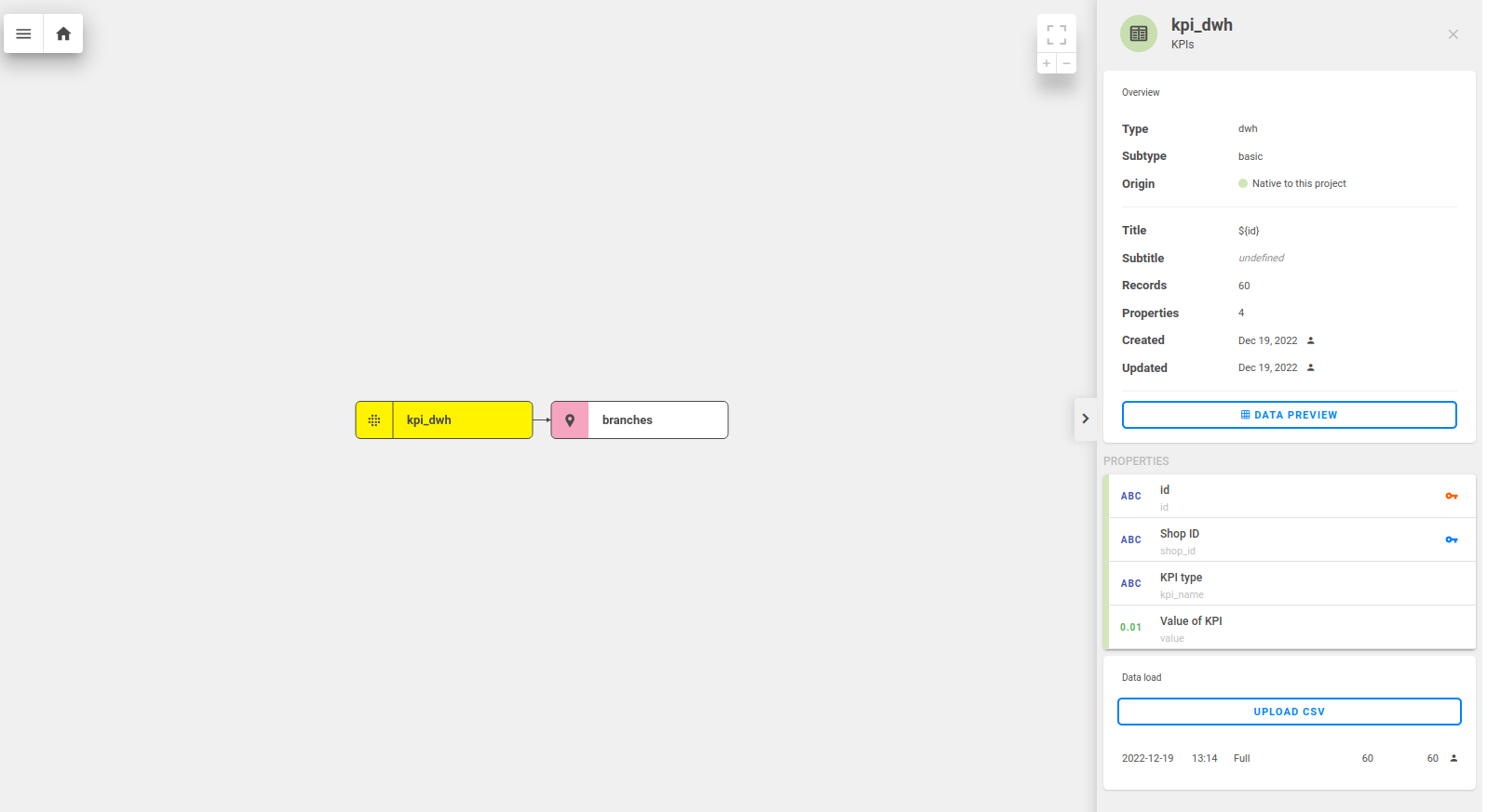 You will be able to load the branches.csv immediately after creating your own project. In order to load, the kpi_dwh table, you must go to the data model, click on the table and use the load CSV button.