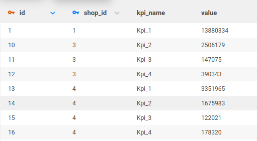 kpi_name - name of the desired one or more KPIs, for example turnover, cost, rent… (there is no limit on the type), string