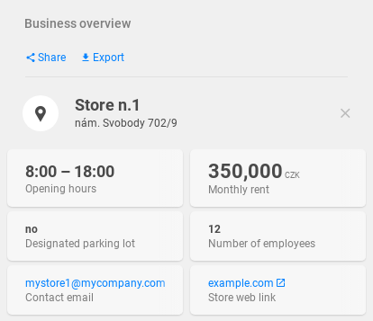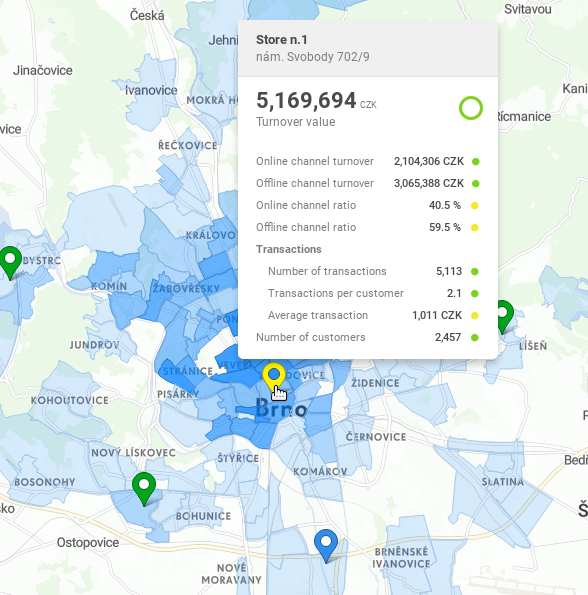 When Turnover value indicator is visualized, after clicking on a marker, catchment area of selected store will be displayed. Catchment areas represent those areas, where a given indicator has the biggest value.