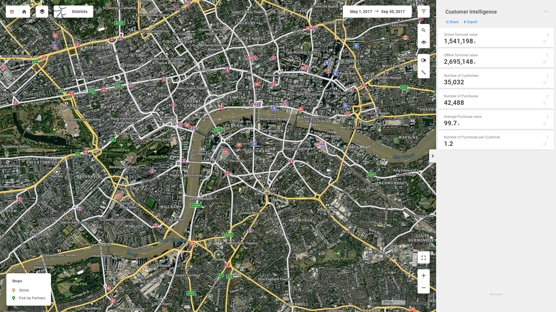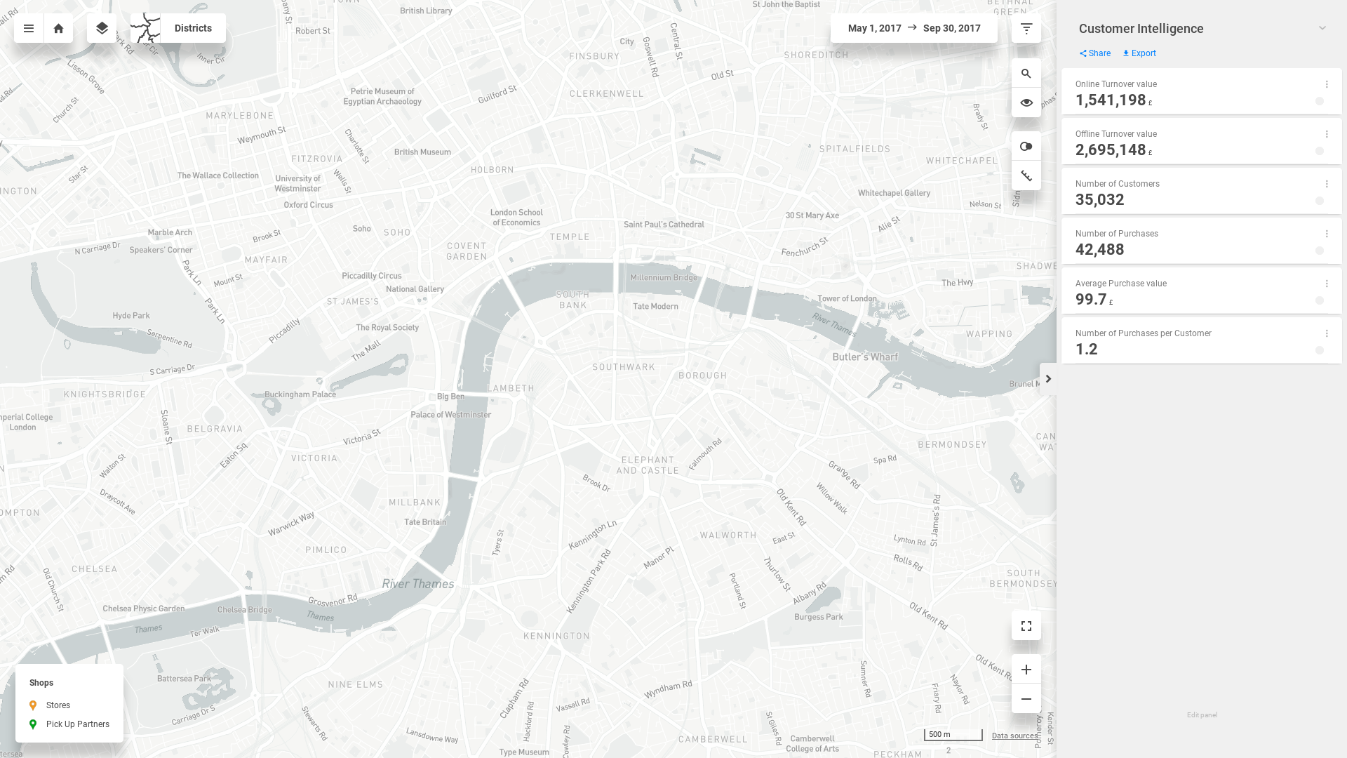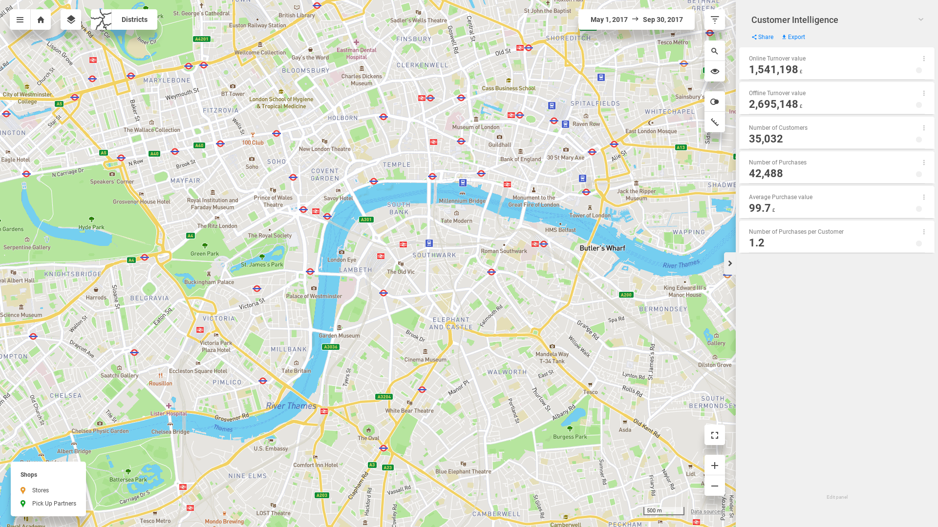 "description": "Identify areas with the biggest and smallest shares of your customers. Find out what turnover these customers generate. Evaluate store rankings and identify the pick-up partners used by customers from different regions. You can also compare the catchment areas for two different stores.",